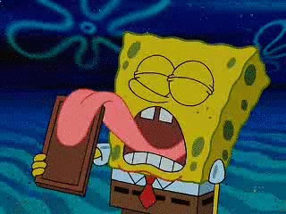 A funny gif of spongebob licking a bar of chocolate